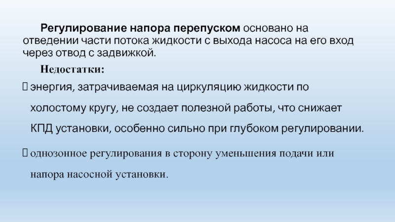 энергия, затрачиваемая на циркуляцию жидкости по холостому кругу, не создает полезной работы, что снижает КПД установки, особенно сильно при глубоком регулировании.