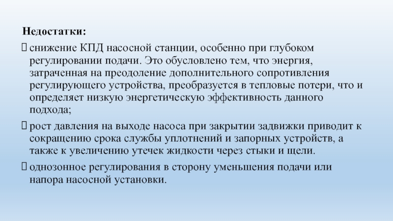 снижение КПД насосной станции, особенно при глубоком регулировании подачи. Это