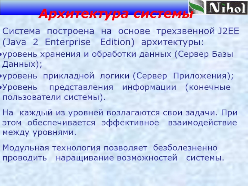 Система построена на основе трехзвенной J2EE (Java 2 Enterprise  Edition) архитектуры: