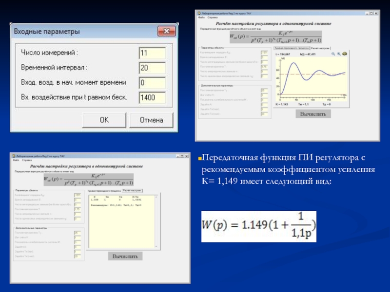Слайд 14Передаточная функция ПИ регулятора с рекомендуемым коэффициентом усиления К= 1,149 имеет