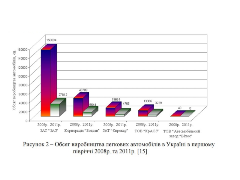 5. ТОВ “Автомобільний завод “Віпос” - крупновузлове складання легкових автомобілів [20]. Обсяг виробництва легкових автомобілів в Україні в першому півріччі 2008р. та 2011р. наведено на рис. 2.
