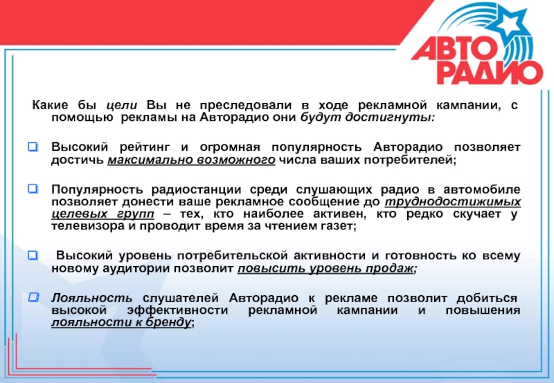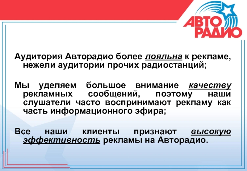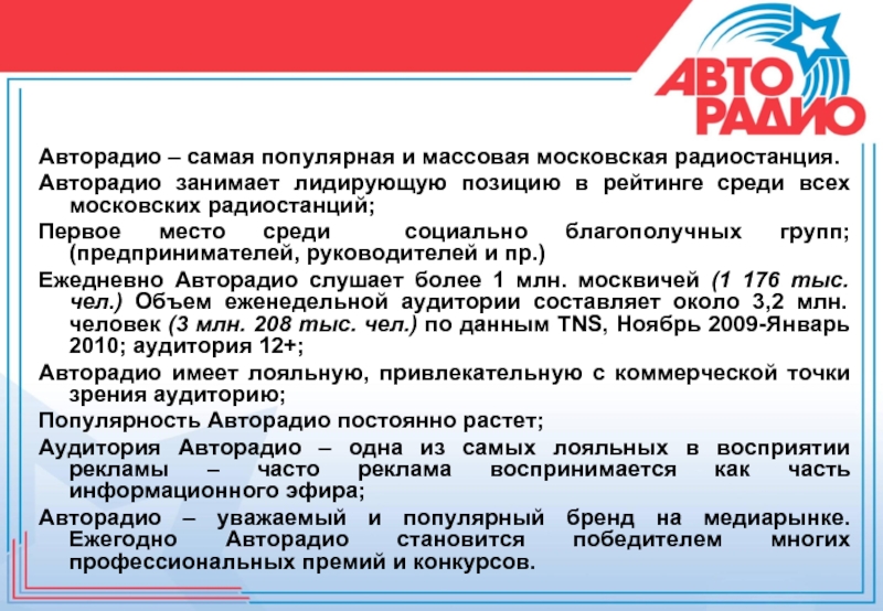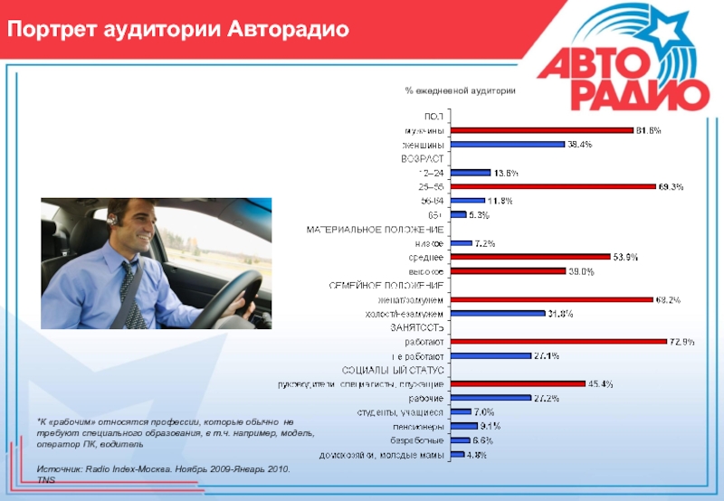 По данным TGI Авторадио еженедельно слушают около 28% представителей данных социальных классов. Эта аудитория наиболее платежеспособна и привлекательна для рекламы широкого спектра товаров и услуг.