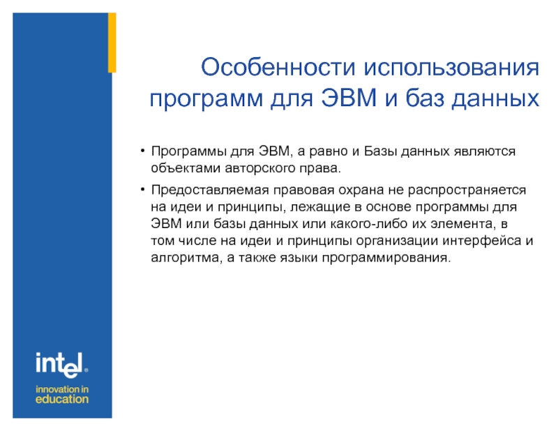 Слайд 24Особенности использования программ для ЭВМ и баз данных
