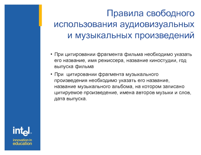 Слайд 20Правила свободного использования аудиовизуальных и музыкальных произведений