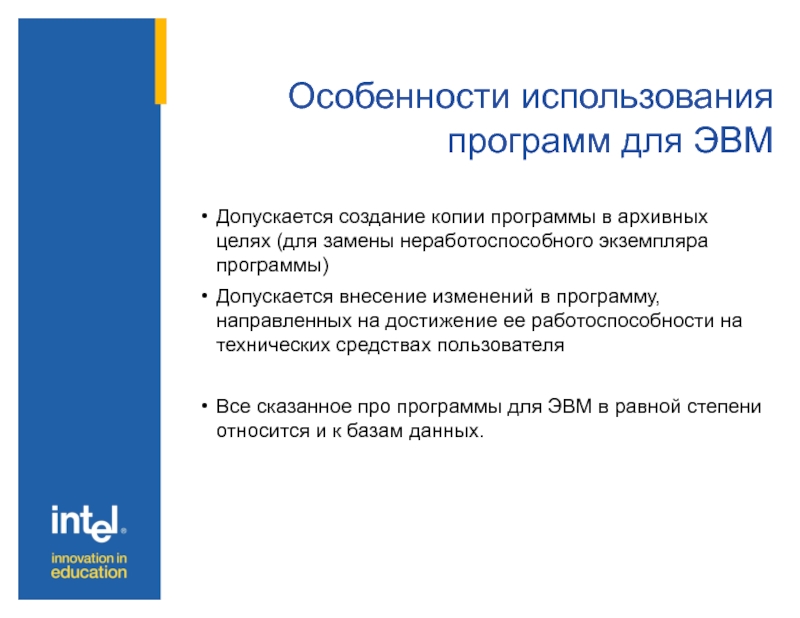 Слайд 25Особенности использования программ для ЭВМ