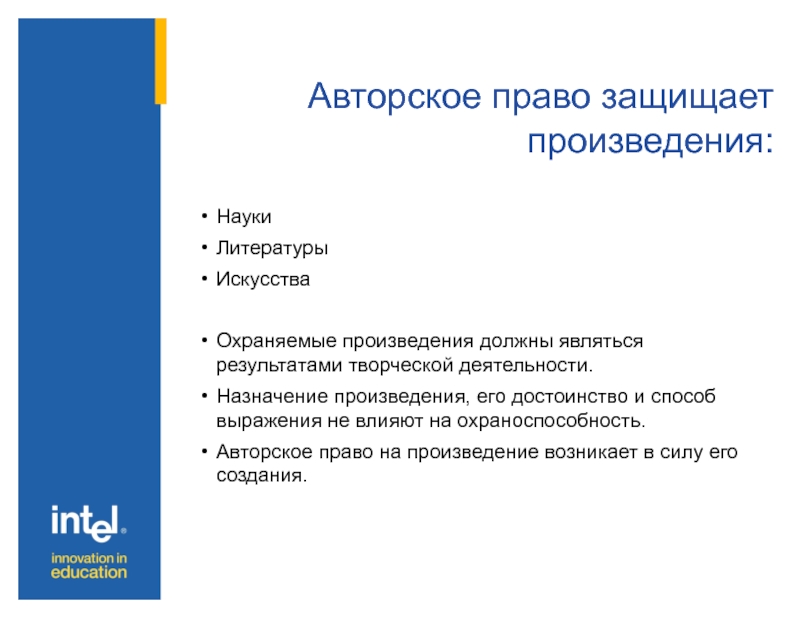 Слайд 3Авторское право защищает произведения: