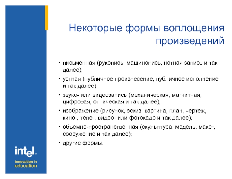 Слайд 5Некоторые формы воплощения произведений