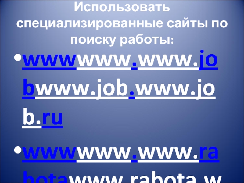 Слайд 13Использовать специализированные сайты по поиску работы: