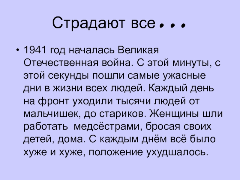 этой секунды пошли самые ужасные дни в жизни всех людей. Каждый день на фронт уходили тысячи людей от мальчишек, до стариков. Женщины шли работать медсёстрами, бросая своих детей, дома. С каждым днём всё было хуже и хуже, положение ухудшалось.