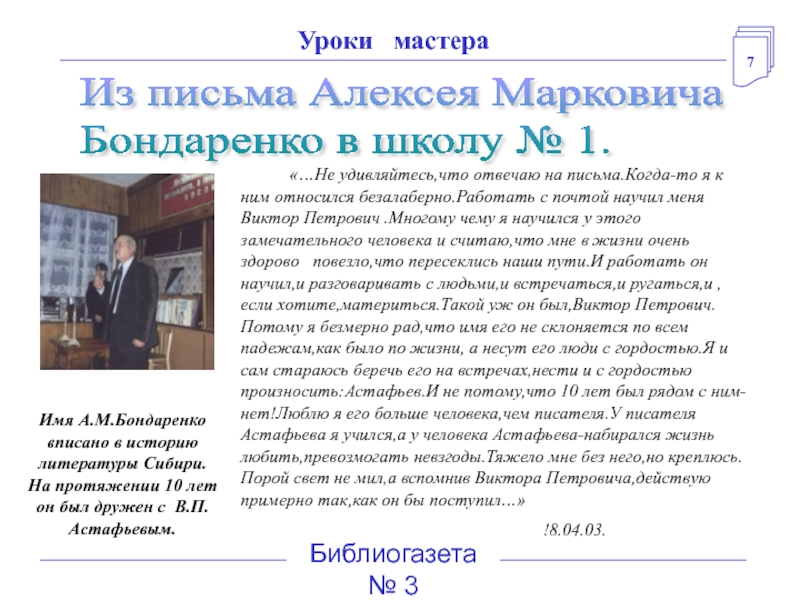 Имя А.М.Бондаренко вписано в историю литературы Сибири.