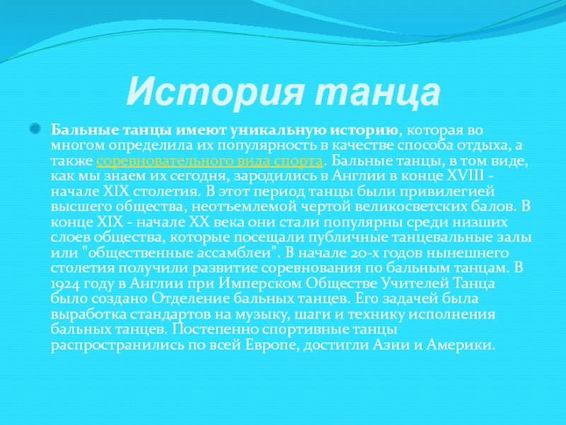 популярность в качестве способа отдыха, а также соревновательного вида спорта. Бальные танцы, в том виде, как мы знаем их сегодня, зародились в Англии в конце XVIII - начале XIX столетия. В этот период танцы были привилегией высшего общества, неотъемлемой чертой великосветских балов. В конце XIX - начале XX века они стали популярны среди низших слоев общества, которые посещали публичные танцевальные залы или "общественные ассамблеи". В начале 20-х годов нынешнего столетия получили развитие соревнования по бальным танцам. В 1924 году в Англии при Имперском Обществе Учителей Танца было создано Отделение бальных танцев. Его задачей была выработка стандартов на музыку, шаги и технику исполнения бальных танцев. Постепенно спортивные танцы распространились по всей Европе, достигли Азии и Америки.