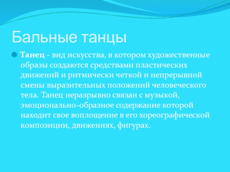 пластических движений и ритмически четкой и непрерывной смены выразительных положений человеческого тела. Танец неразрывно связан с музыкой, эмоционально-образное содержание которой находит свое воплощение в его хореографической композиции, движениях, фигурах.