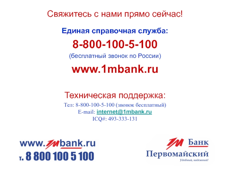 Тел: 8-800-100-5-100 (звонок бесплатный) E-mail: internet@1mbank.ru ICQ#: 493-333-131