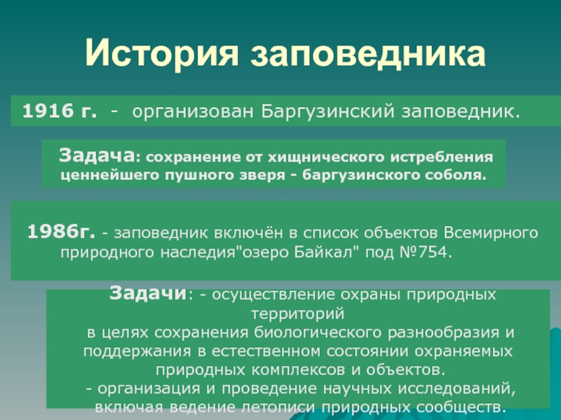 Осуществление охраны в целях сохранения биологического разнообразия и поддержания в естественном состояние охраняемых природных комплексов и объектов Баргузинского заповедника.