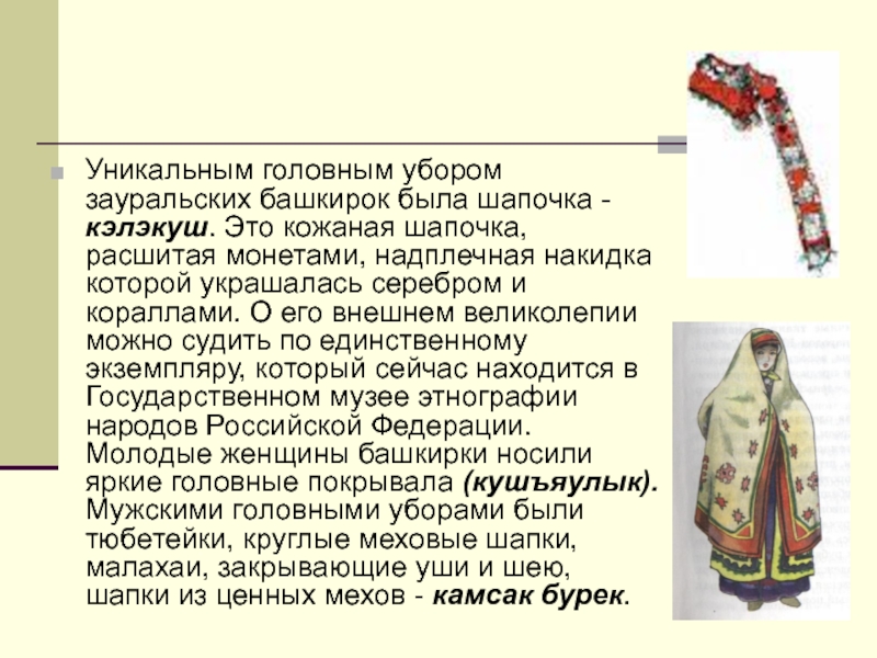 шапочка, расшитая монетами, надплечная накидка которой украшалась серебром и кораллами. О его внешнем великолепии можно судить по единственному экземпляру, который сейчас находится в Государственном музее этнографии народов Российской Федерации. Молодые женщины башкирки носили яркие головные покрывала (кушъяулык). Мужскими головными уборами были тюбетейки, круглые меховые шапки, малахаи, закрывающие уши и шею, шапки из ценных мехов - камсак бурек.