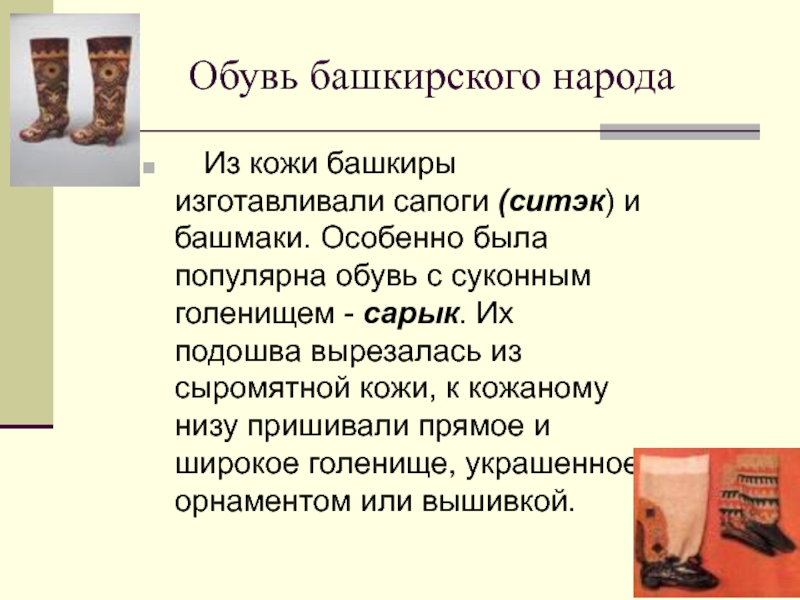 Из кожи башкиры изготавливали сапоги (ситэк) и башмаки. Особенно