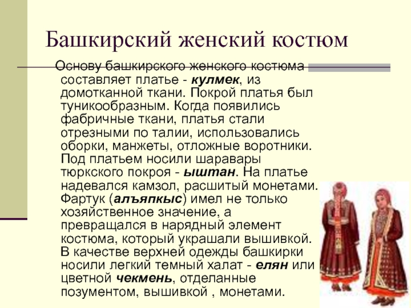 домотканной ткани. Покрой платья был туникообразным. Когда появились фабричные ткани, платья стали отрезными по талии, использовались оборки, манжеты, отложные воротники. Под платьем носили шаравары тюркского покроя - ыштан. На платье надевался камзол, расшитый монетами. Фартук (алъяпкыс) имел не только хозяйственное значение, а превращался в нарядный элемент костюма, который украшали вышивкой. В качестве верхней одежды башкирки носили легкий темный халат - елян или цветной чекмень, отделанные позументом, вышивкой , монетами.