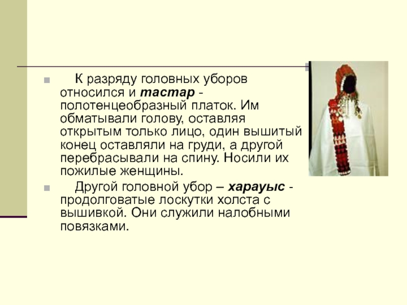 К разряду головных уборов относился и тастар - полотенцеобразный платок. Им