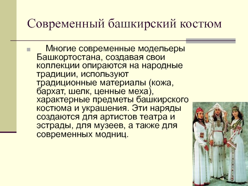 народные традиции, используют традиционные материалы (кожа, бархат, шелк, ценные меха), характерные предметы башкирского костюма и украшения. Эти наряды создаются для артистов театра и эстрады, для музеев, а также для современных модниц.