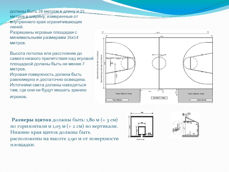 Размеры щитов должны быть: 1,80 м (+ 3 см) по горизонтали и 1,05 м (+ 2 см) по вертикали. Нижние края щитов должны быть расположены на высоте 2,90 м от поверхности площадки.
