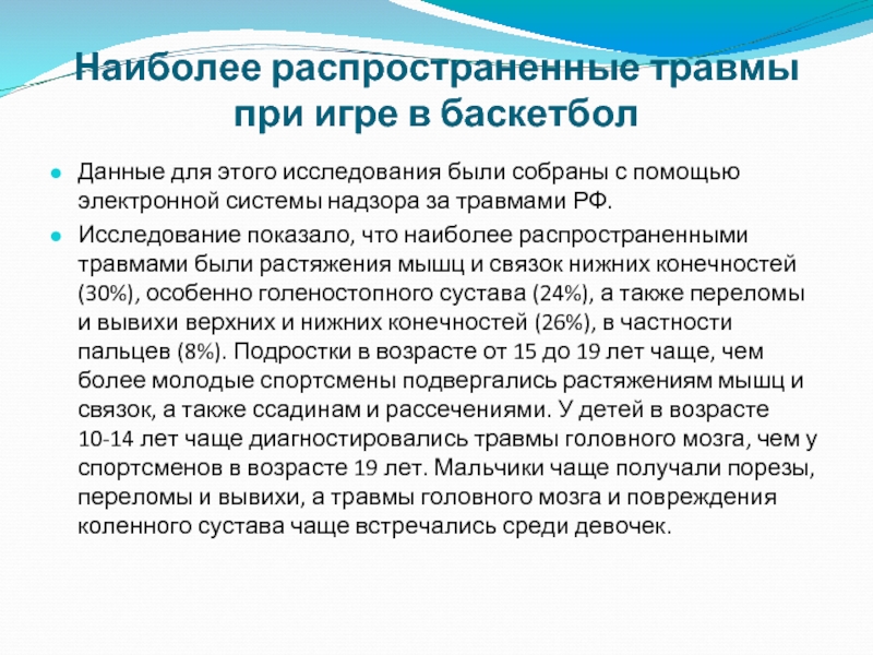 Исследование показало, что наиболее распространенными травмами были растяжения мышц и связок нижних конечностей (30%), особенно голеностопного сустава (24%), а также переломы и вывихи верхних и нижних конечностей (26%), в частности пальцев (8%). Подростки в возрасте от 15 до 19 лет чаще, чем более молодые спортсмены подвергались растяжениям мышц и связок, а также ссадинам и рассечениями. У детей в возрасте 10-14 лет чаще диагностировались травмы головного мозга, чем у спортсменов в возрасте 19 лет. Мальчики чаще получали порезы, переломы и вывихи, а травмы головного мозга и повреждения коленного сустава чаще встречались среди девочек.