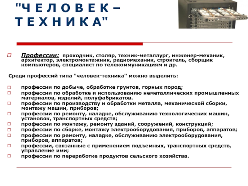 Среди профессий типа "человек-техника" можно выделить: