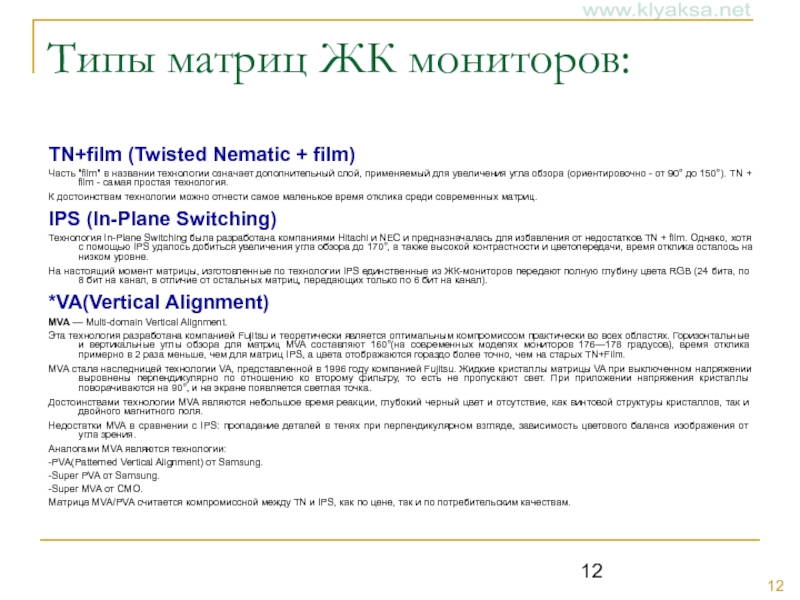 Слайд 12Типы матриц ЖК мониторов: