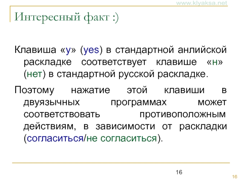 Поэтому нажатие этой клавиши в двуязычных программах может соответствовать противоположным действиям, в зависимости от раскладки (согласиться/не согласиться).
