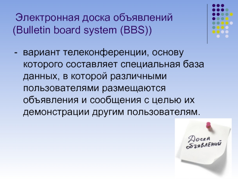 основу которого составляет специальная база данных, в которой различными пользователями размещаются объявления и сообщения с целью их демонстрации другим пользователям.