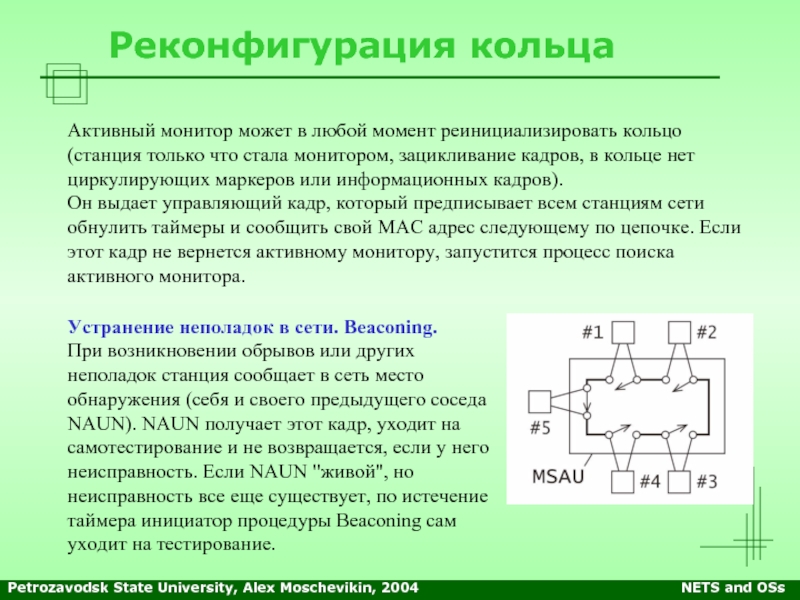 При возникновении обрывов или других неполадок станция сообщает в сеть место обнаружения (себя и своего предыдущего соседа NAUN). NAUN получает этот кадр, уходит на самотестирование и не возвращается, если у него неисправность. Если NAUN "живой", но неисправность все еще существует, по истечение таймера инициатор процедуры Beaconing сам уходит на тестирование.