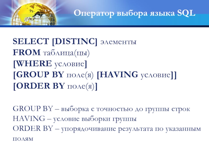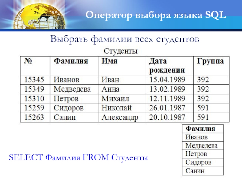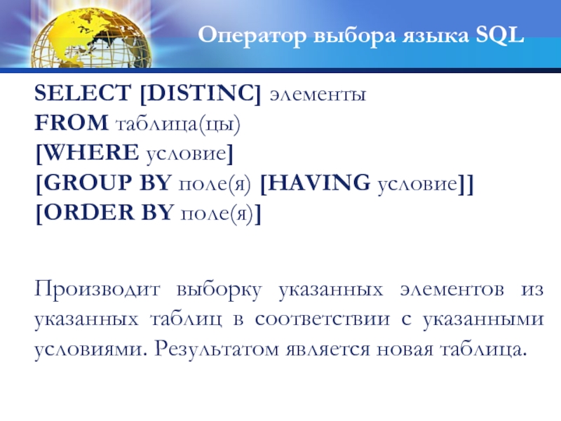 Производит выборку указанных элементов из указанных таблиц в соответствии с указанными условиями. Результатом является новая таблица.