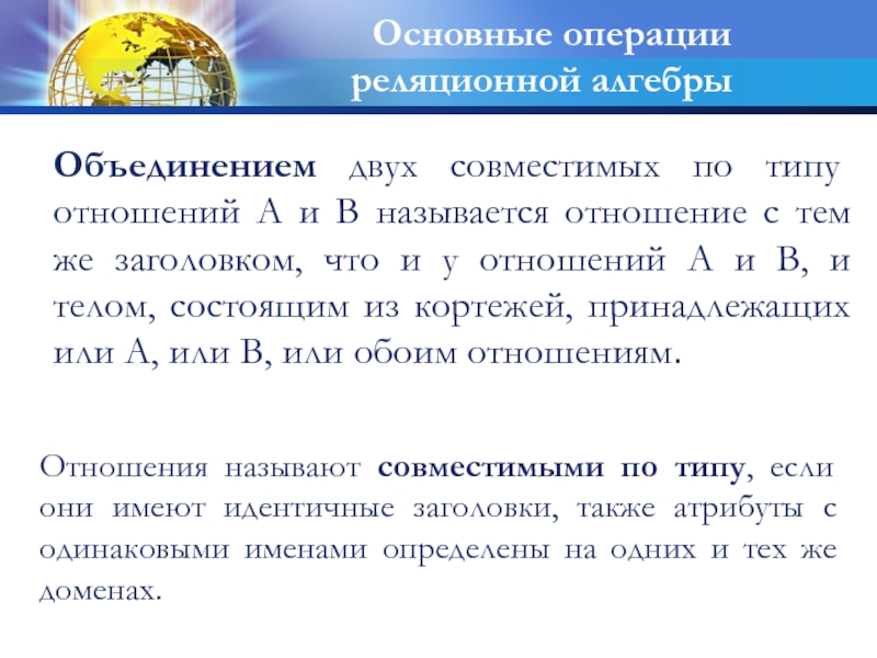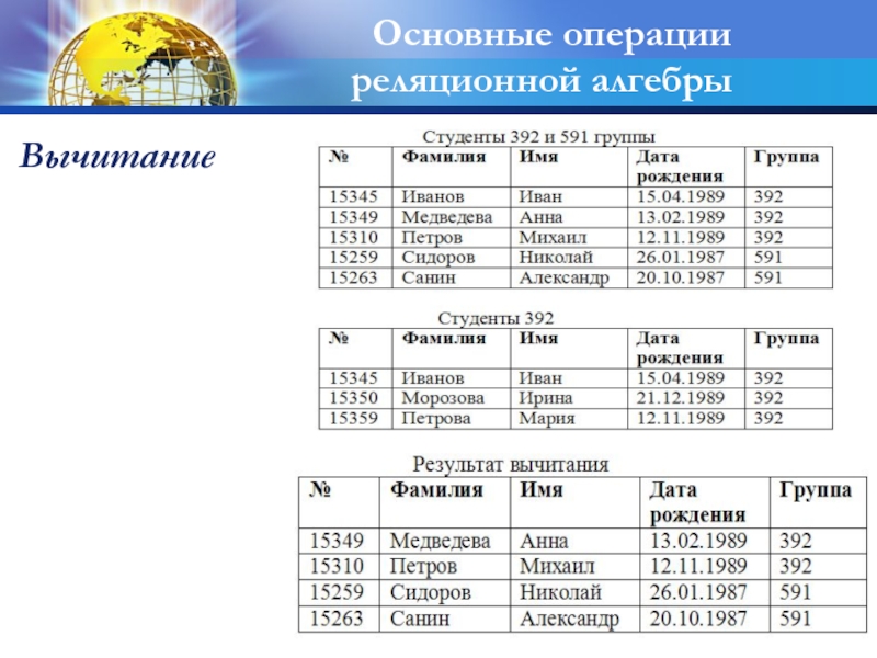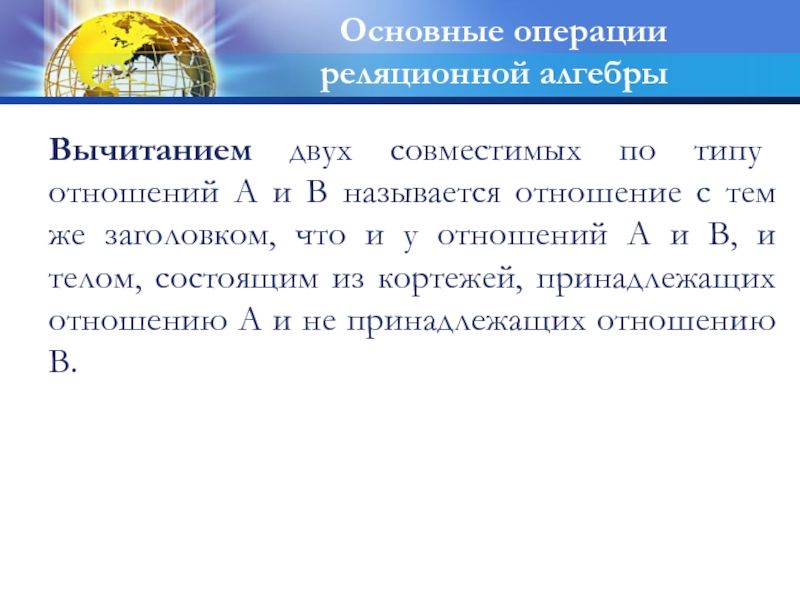 с тем же заголовком, что и у отношений А и В, и телом, состоящим из кортежей, принадлежащих отношению А и не принадлежащих отношению В.