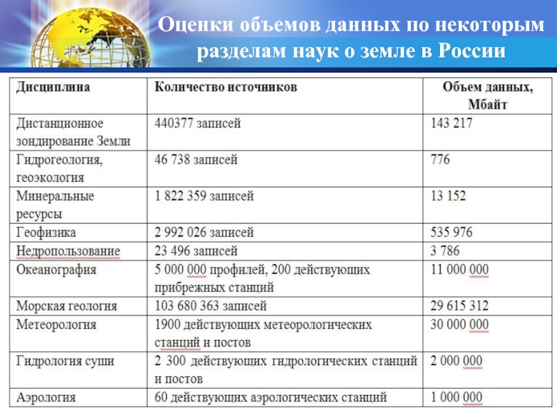 Слайд 5Оценки объемов данных по некоторым разделам наук о земле в России