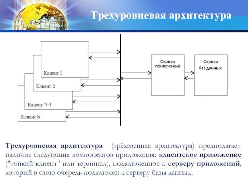 Трехуровневая архитектура (трёхзвенная архитектура) предполагает наличие следующих компонентов приложения: клиентское