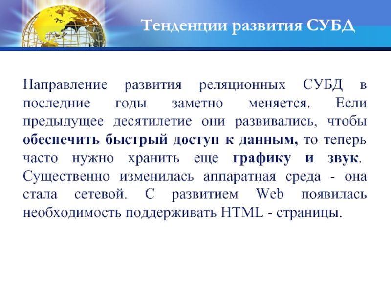 меняется. Если предыдущее десятилетие они развивались, чтобы обеспечить быстрый доступ к данным, то теперь часто нужно хранить еще графику и звук. Существенно изменилась аппаратная среда - она стала сетевой. С развитием Web появилась необходимость поддерживать HTML - страницы.