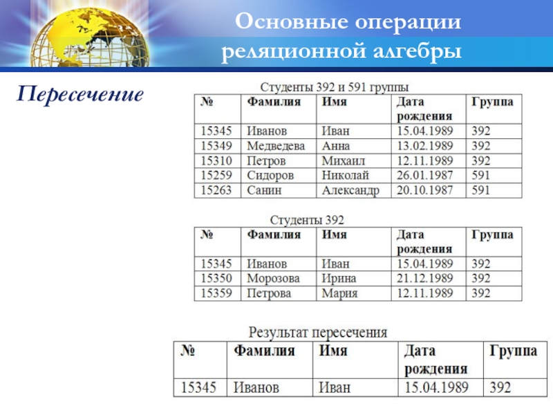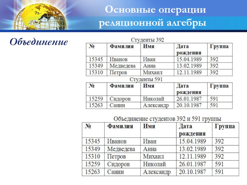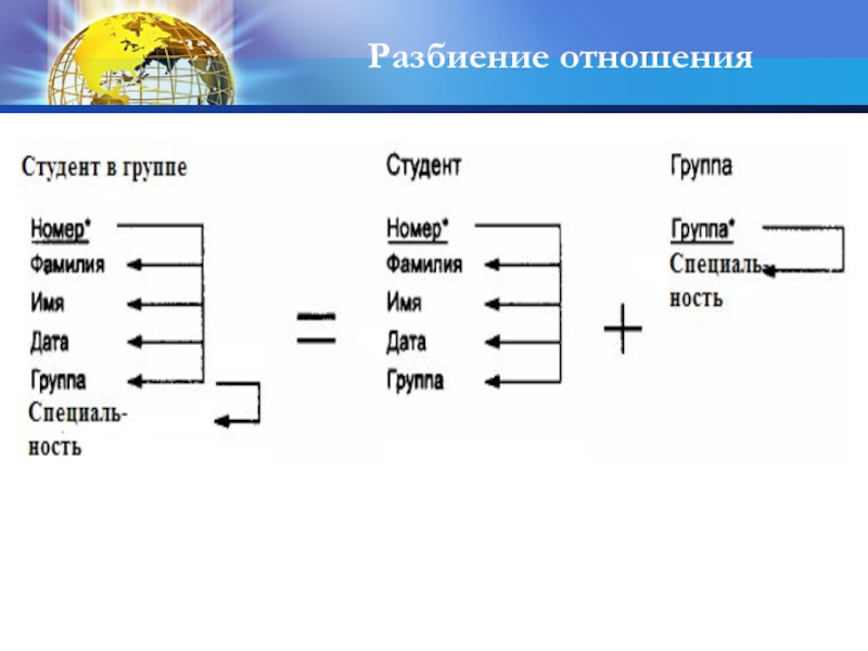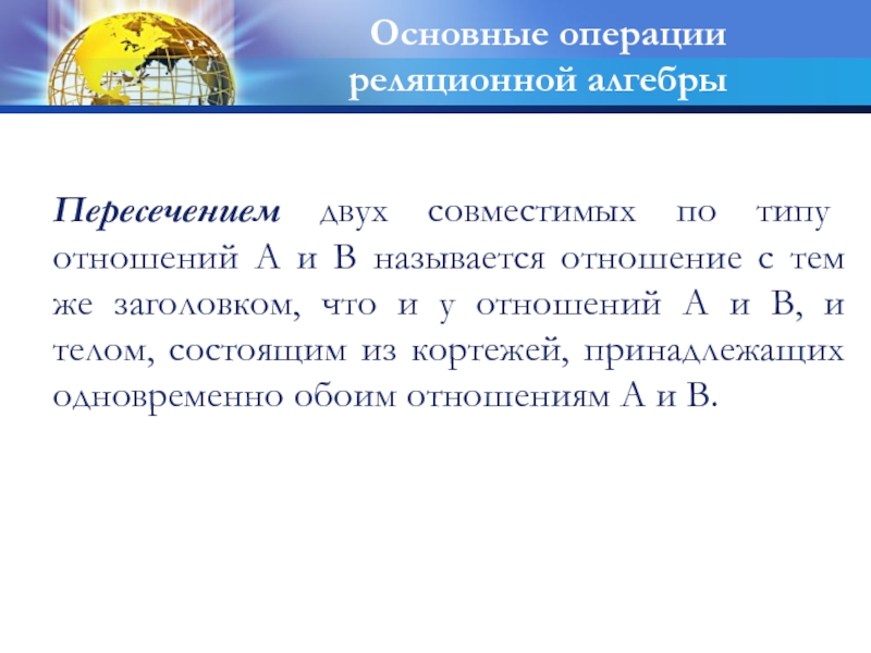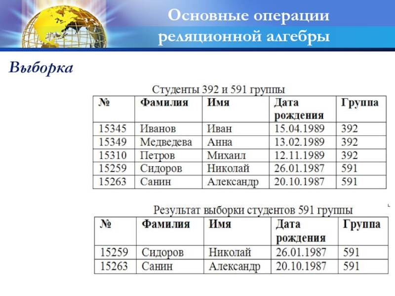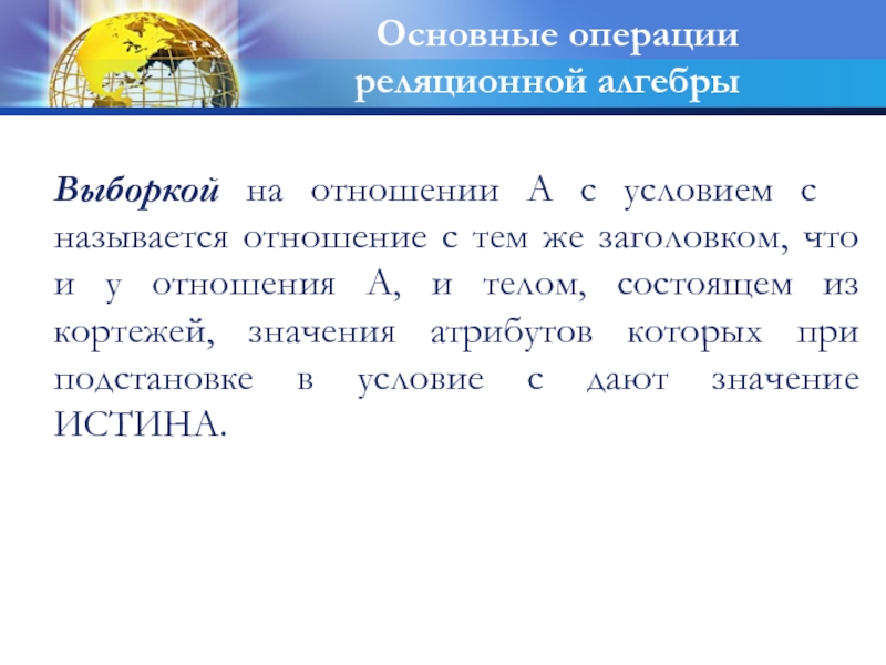 тем же заголовком, что и у отношения А, и телом, состоящем из кортежей, значения атрибутов которых при подстановке в условие с дают значение ИСТИНА.