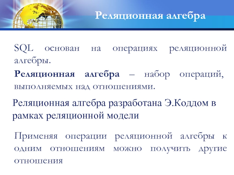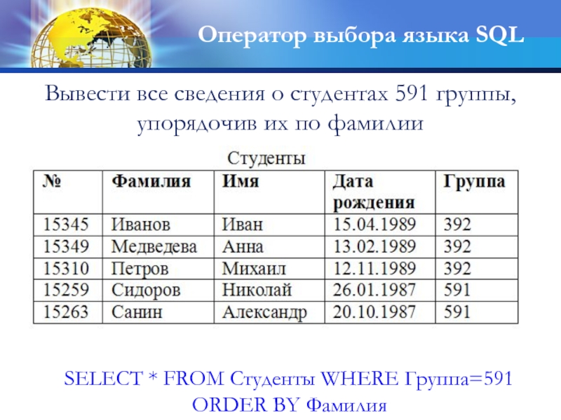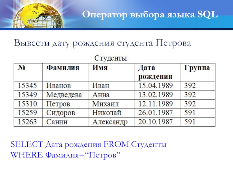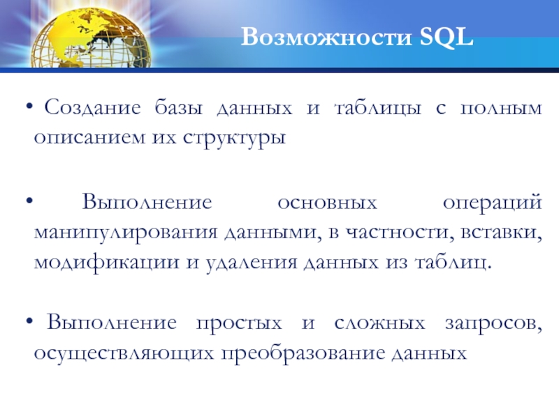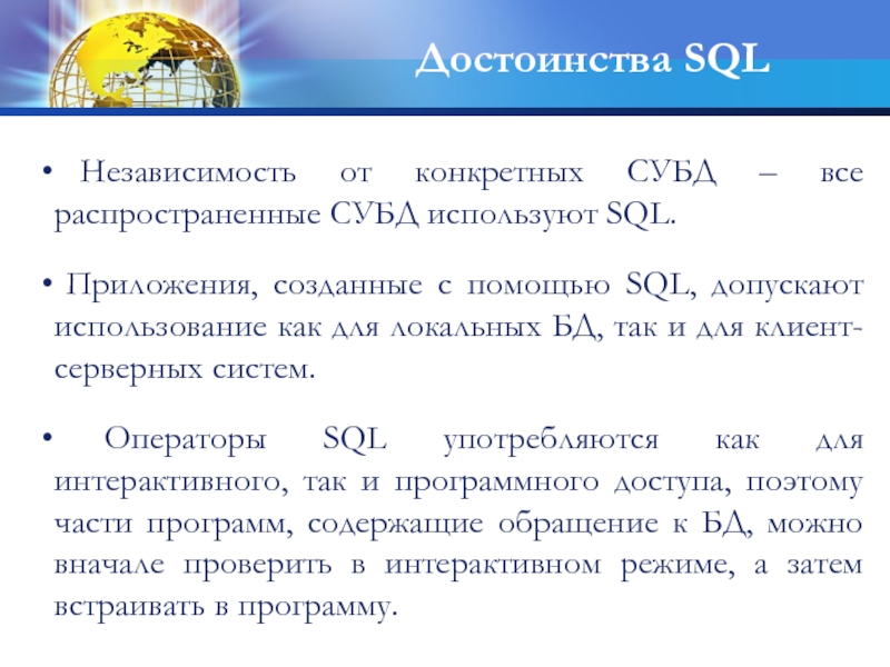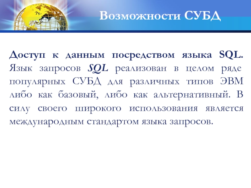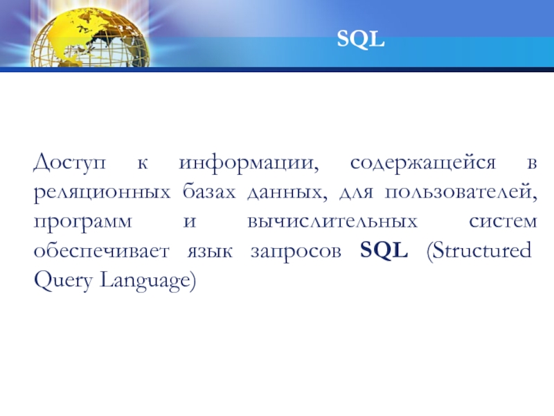 Слайд 94Доступ к данным посредством языка SQL. Язык запросов SQL реализован в