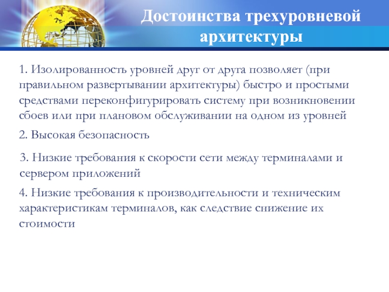 1. Изолированность уровней друг от друга позволяет (при правильном развертывании архитектуры) быстро и простыми средствами переконфигурировать систему при возникновении сбоев или при плановом обслуживании на одном из уровней