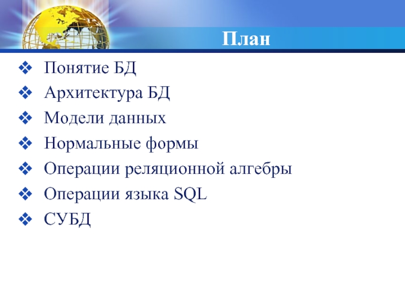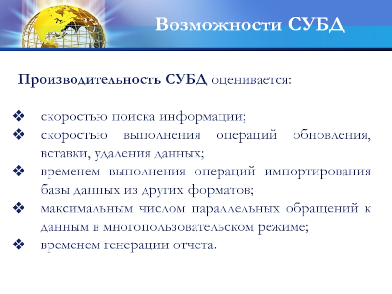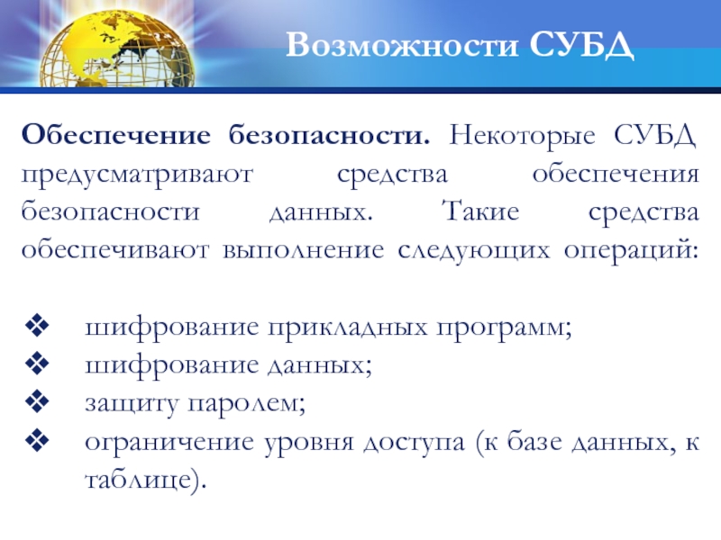 Слайд 93Обеспечение безопасности. Некоторые СУБД предусматривают средства обеспечения безопасности данных. Такие средства