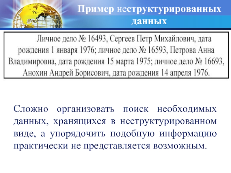 Сложно организовать поиск необходимых данных, хранящихся в неструктурированном