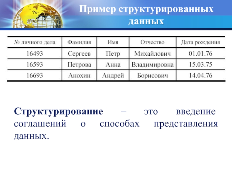 совокупность сведений о конкретных объектах реального мира в какой-либо предметной области.
