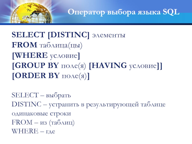 DISTINC – устранить в результирующей таблице одинаковые строки