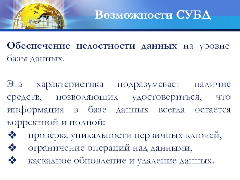 средств, позволяющих удостовериться, что информация в базе данных всегда остается корректной и полной: