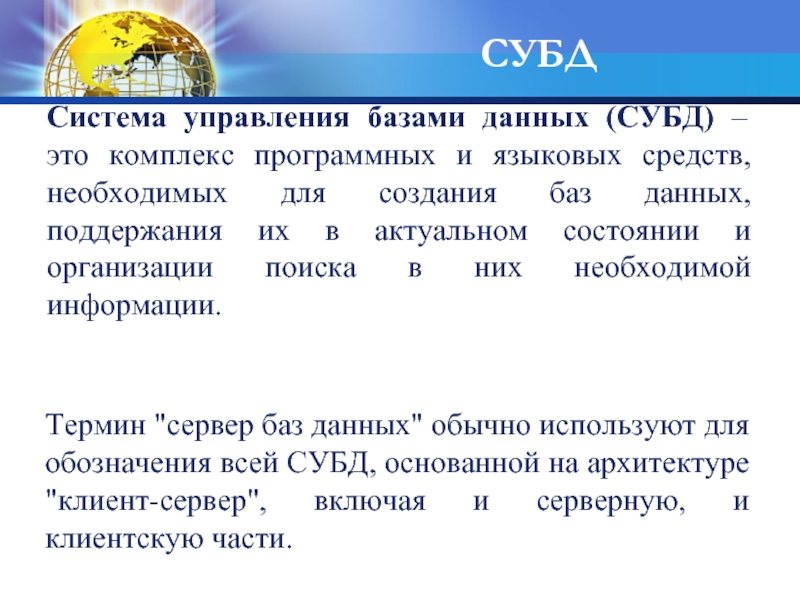 Термин "сервер баз данных" обычно используют для обозначения всей СУБД, основанной на архитектуре "клиент-сервер", включая и серверную, и клиентскую части.