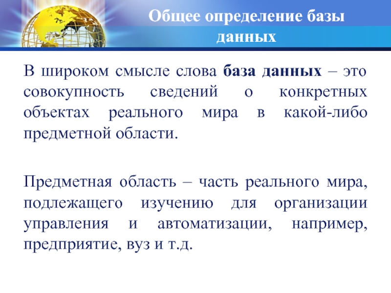 Предметная область – часть реального мира, подлежащего изучению для организации управления и автоматизации, например, предприятие, вуз и т.д.