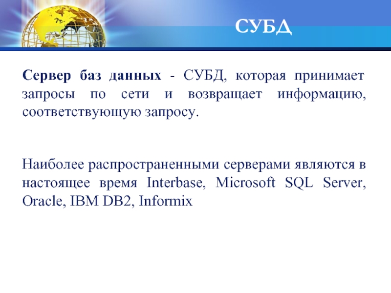 Наиболее распространенными серверами являются в настоящее время Interbase, Microsoft SQL Server, Oracle, IBM DB2, Informix