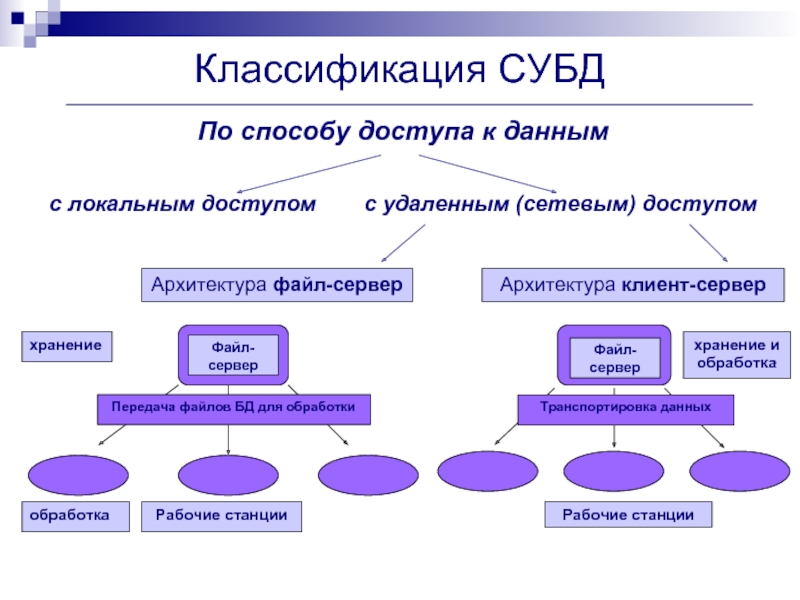 централизованные (локальные, файл – серверные, клиент-серверные) и распределённые СУБД.