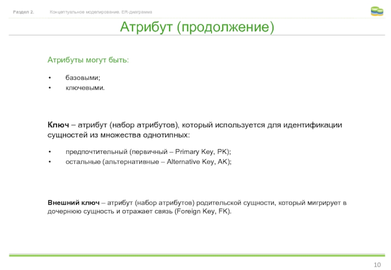 Внешний ключ – атрибут (набор атрибутов) родительской сущности, который мигрирует в дочернюю сущность и отражает связь (Foreign Key, FK).