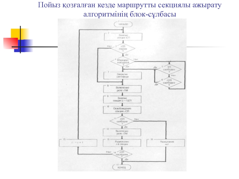 Слайд 8Пойыз қозғалған кезде маршрутты секциялы ажырату алгоритмінің блок-сұлбасы