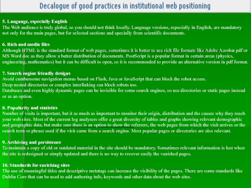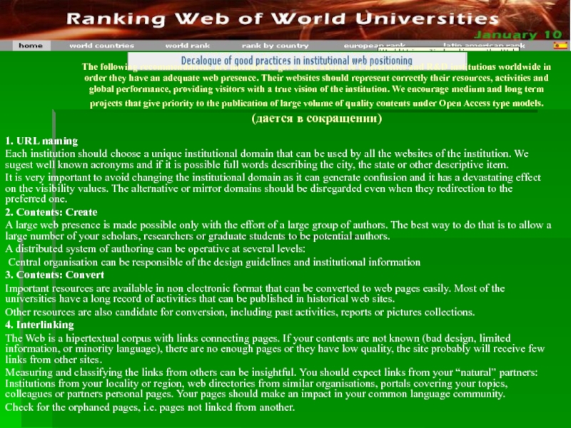 and R&D institutions worldwide in order they have an adequate web presence. Their websites should represent correctly their resources, activities and global performance, providing visitors with a true vision of the institution. We encourage medium and long term projects that give priority to the publication of large volume of quality contents under Open Access type models.